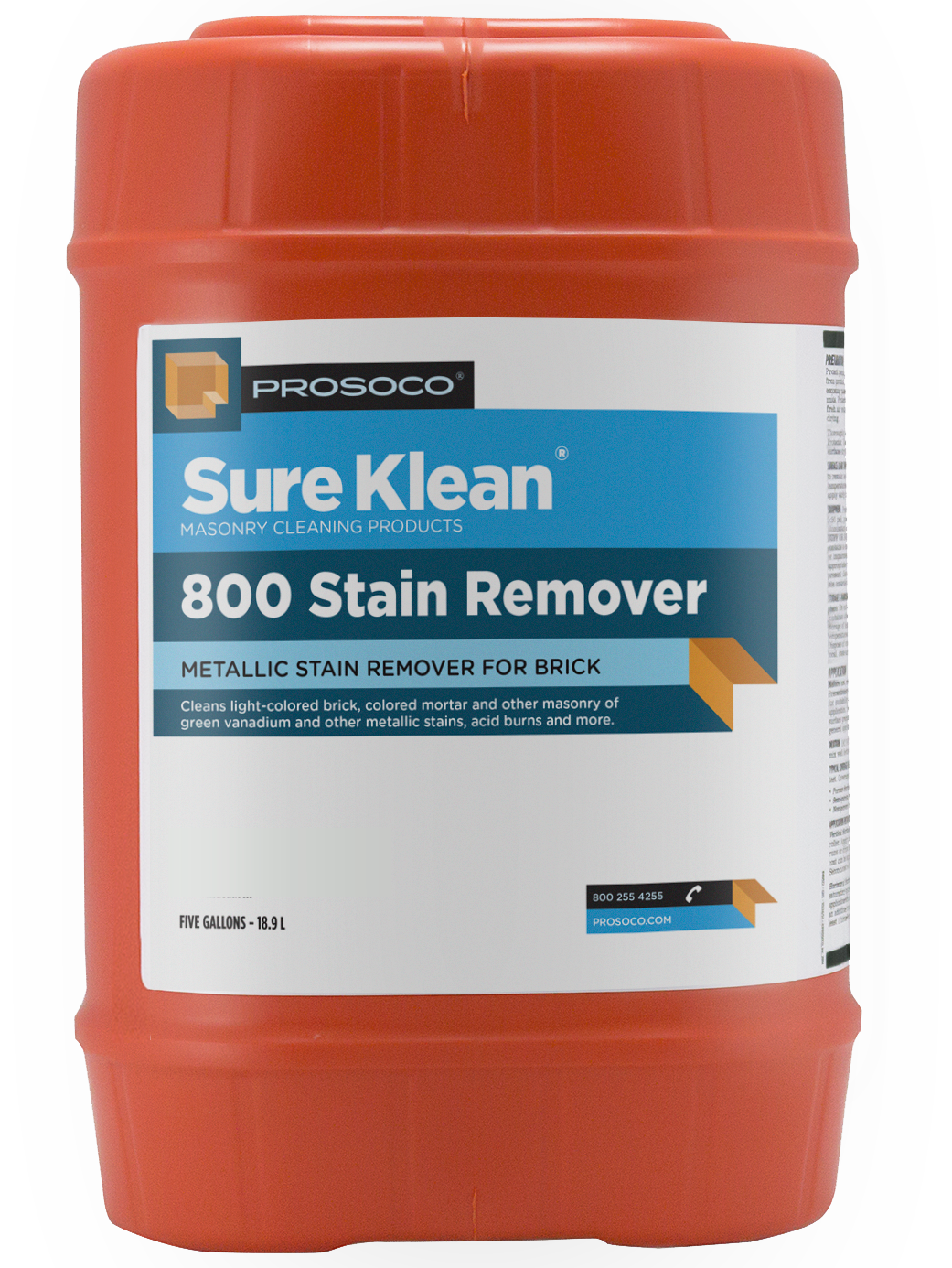 PROSOCO® Sure Klean® 800 Stain Remover is a specialty masonry cleaning product that effectively removes green vanadium stains commonly found in buff or white brick. It also removes straw stains, acid burns and other metallic discolorations from most masonry surfaces. Removes tough metallic stains quickly and easily. Recommended for surfaces containing colored mortar. Water-rinsable.