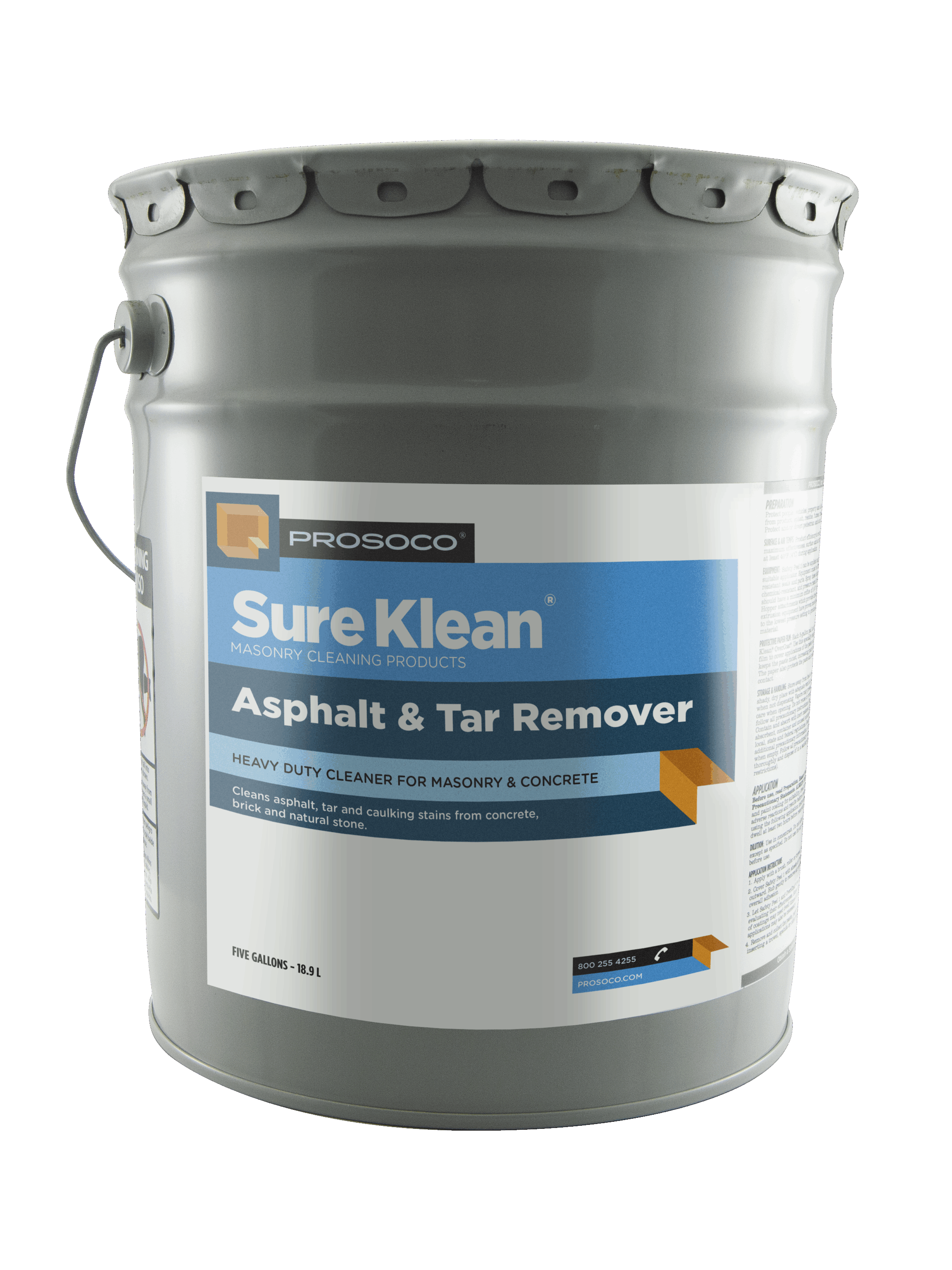 PROSOCO® Sure Klean® Asphalt & Tar Remover is a multi-purpose solvent cleaner for masonry and concrete. It efficiently removes asphalt tar, grease, oils and sealers. Ideal for cleaning and surface preparation, Asphalt & Tar Remover will not damage most masonry or concrete Removes asphalt tar/roofing asphalt (roofer’s stain), grease, hydraulic oil, motor oil and caulking stains common on construction projects, as well as sealers and protective treatments such as old curing compounds, acrylic, stearate, and chlorinated rubber sealers. Excellent for spot cleaning chewing gum, crayon and lipstick stains. Easy to apply and water-rinsable.