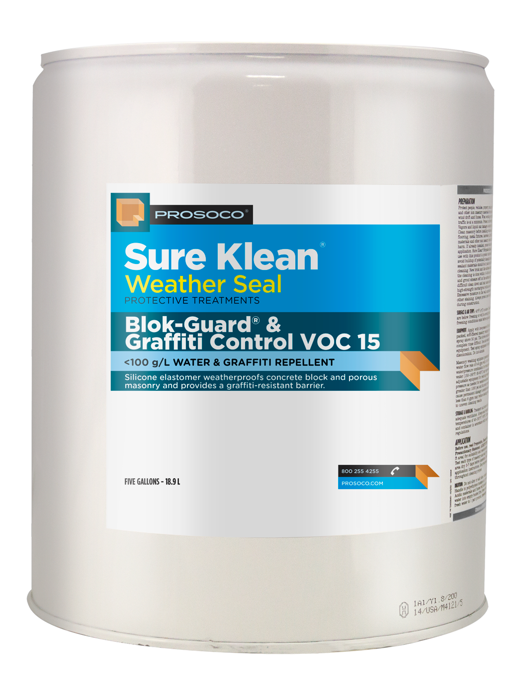 Blok-Guard & Graffiti Control VOC 15 (formerly called Blok-Guard & Graffiti Control Ultra 15) penetrates and fills pores to prevent water penetration through exterior walls exposed to normal weathering. Graffiti removal is fast and easy using PROSOCO’s Graffiti Remover product. Blok-Guard & Graffiti Control VOC 15 is easy to apply with low-pressure spray, brush or roller. Treated surfaces exhibit excellent surface beading, withstand extreme temperatures and do not trap moisture. Offers excellent UV stability.