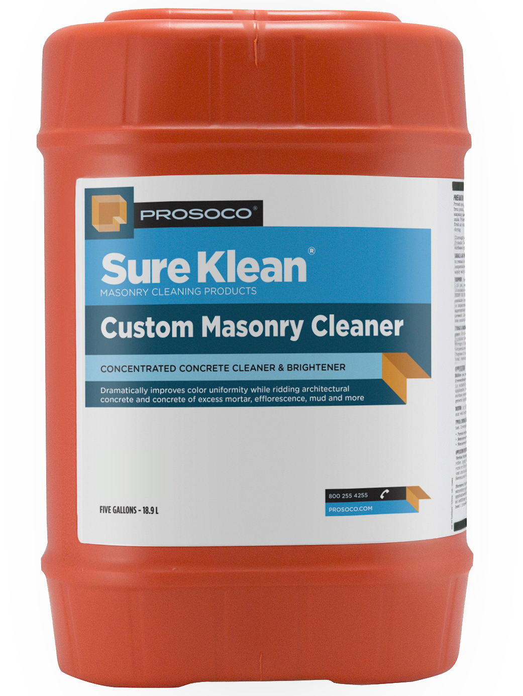 Sure Klean® Custom Masonry Cleaner removes concrete splashes, excess mortar, mud, retarders, heavy efflorescence, embedded stains, rust and surface soiling from textured custom masonry surfaces. This concentrated, general-purpose acidic cleaner improves the color and uniformity of most custom masonry and colored concrete. When used in strong solutions, Custom Masonry Cleaner can be used for additional aggregate exposure (“weathering”).